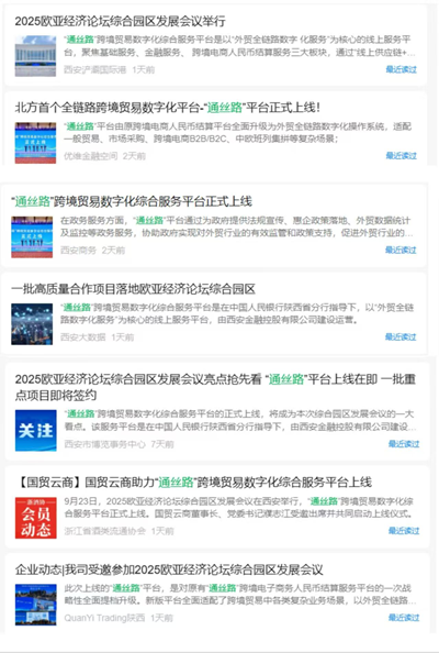 近日,由西安金融控股有限公司建設(shè)運(yùn)營(yíng)的“通絲路”跨境貿(mào)易數(shù)字化綜合服務(wù)平臺(tái)(以下簡(jiǎn)稱“通絲路”平臺(tái)),在2025歐亞經(jīng)濟(jì)論壇綜合園區(qū)發(fā)展會(huì)議上正式提檔升級(jí)上線。此次上線是助力“一帶一路”貿(mào)易便利化的重大舉措,引發(fā)陜西日?qǐng)?bào)、華商網(wǎng)、陜西新聞網(wǎng)、西部網(wǎng)、三秦網(wǎng)、今日頭條、搜狐新聞等媒體,以及西安商務(wù)、陜西自貿(mào)試驗(yàn)區(qū)西安管委會(huì)、西安市博覽事務(wù)中心、西安浐灞國(guó)際港、西安大數(shù)據(jù)等微信公眾平臺(tái)相繼關(guān)注報(bào)道,相關(guān)話題迅速成為區(qū)域外貿(mào)領(lǐng)域關(guān)注焦點(diǎn)。